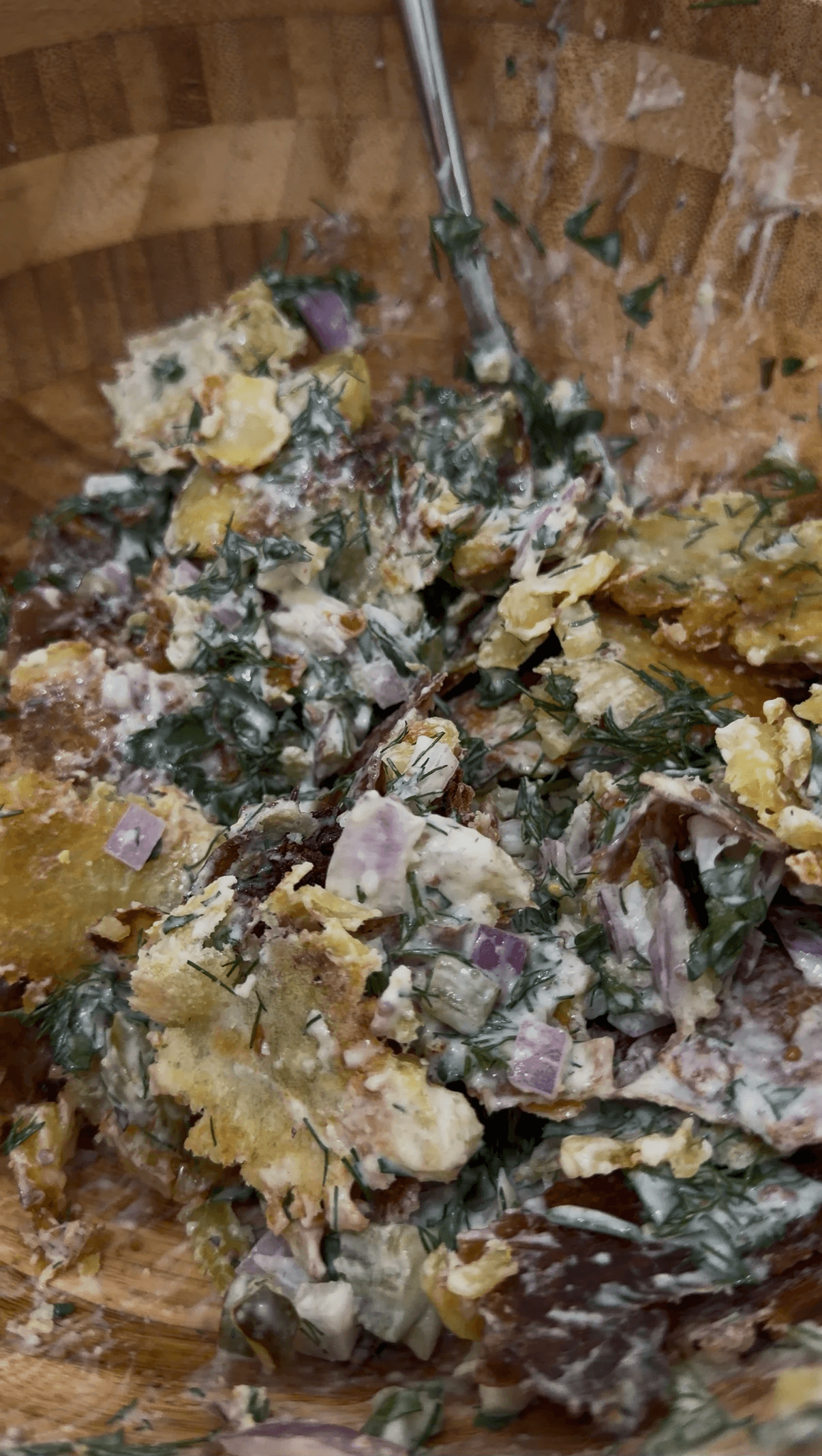 Combine everything in a bowl and mix right before serving - too early and your crispy potatoes won't be so crisp :)